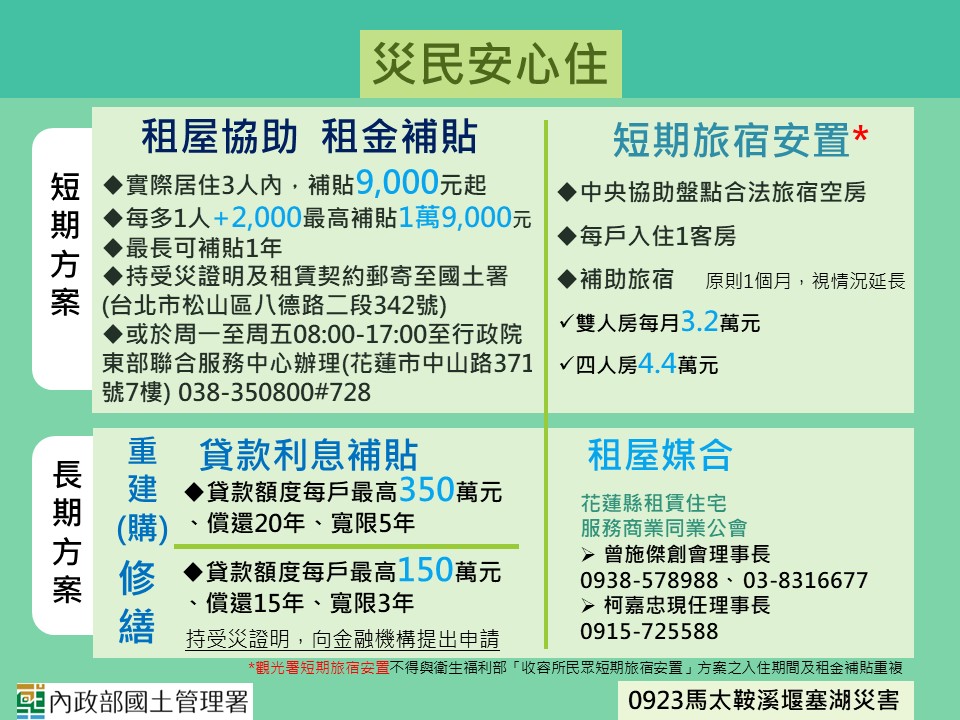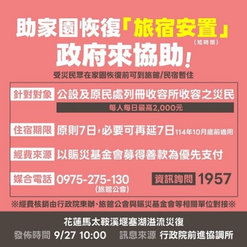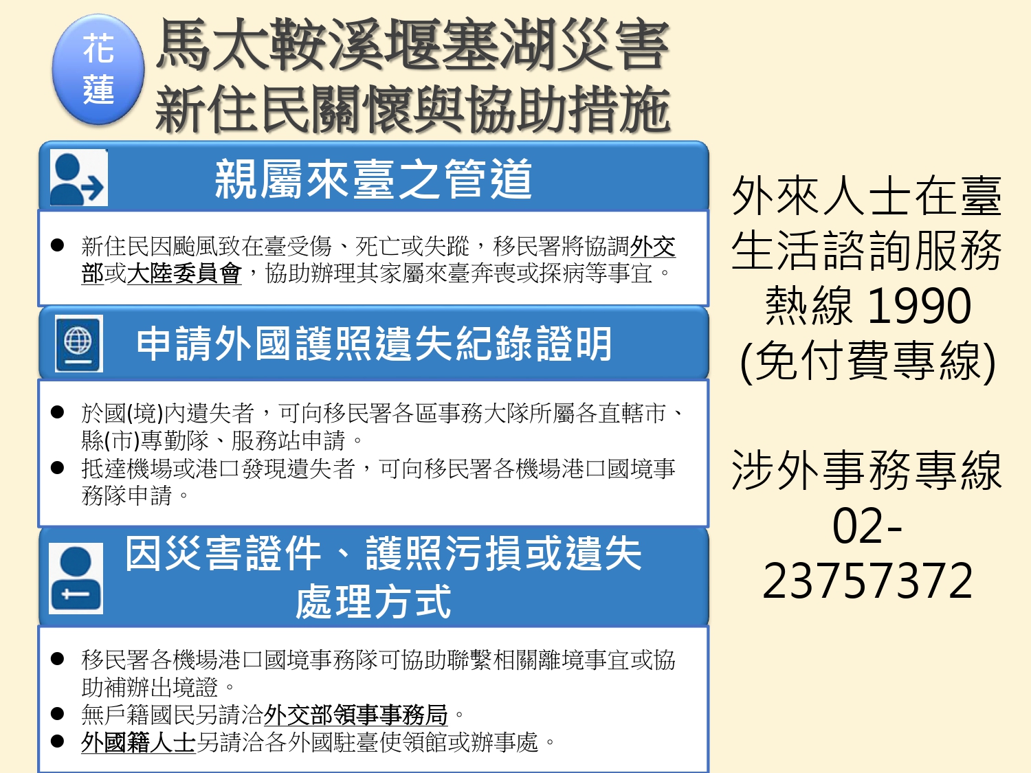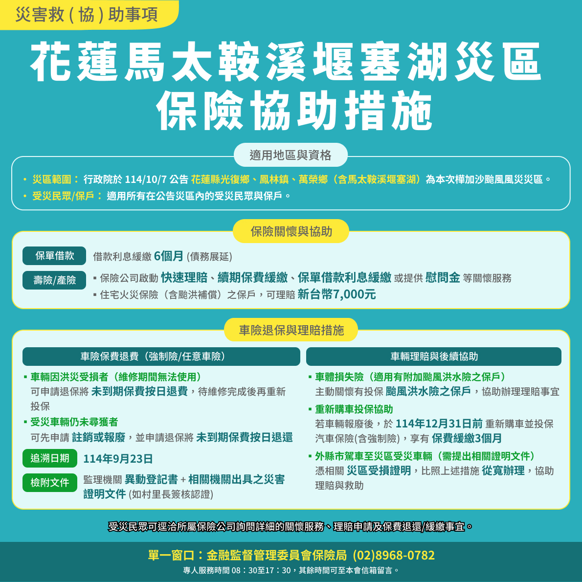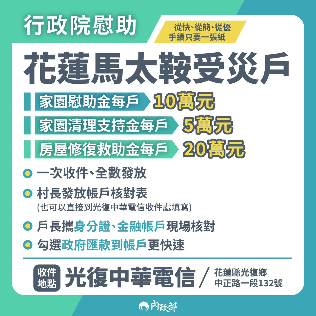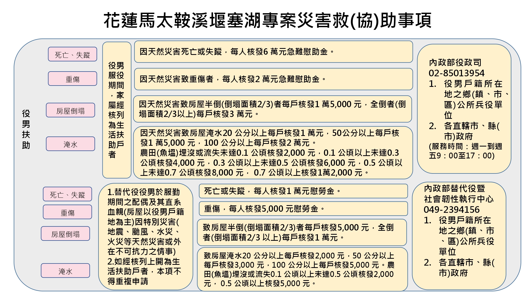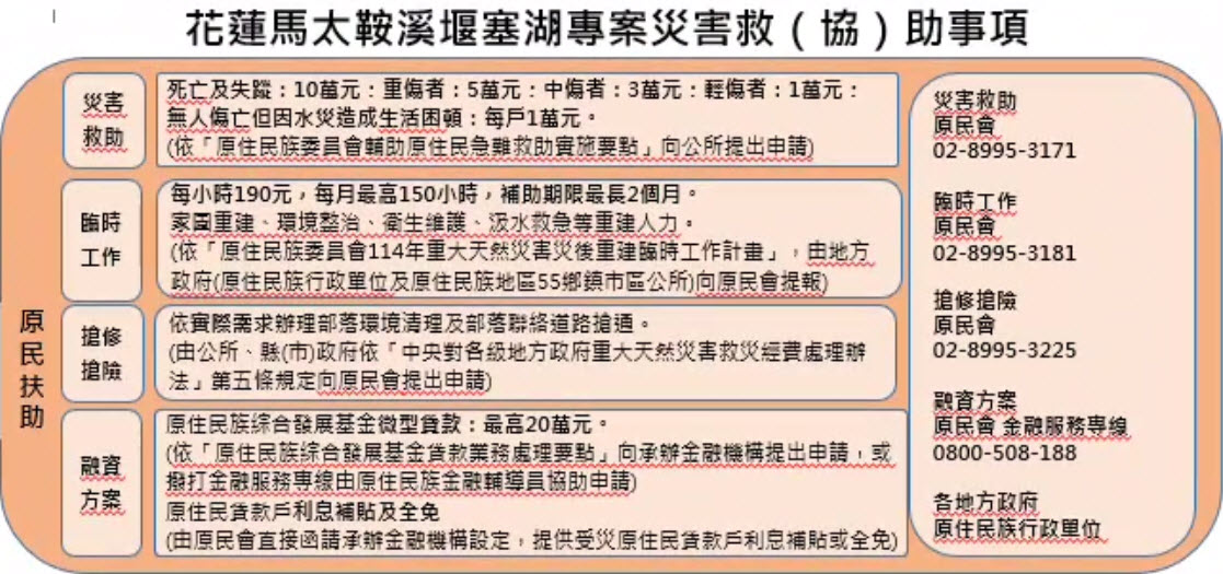 為利重大天然災害發生後即時揭露政府各項提供受災民眾之「災害救(協)助事項」,本會報已彙整相關機關(單位、機構)「花蓮馬太鞍溪堰塞湖專案災害救(協)助事項」公告連結「一站式網頁」,以強化災後復原資訊揭露並供民眾即時查閱。相關「災害救(協)助事項」如下所示,各部會措施請點以下相關連結。
