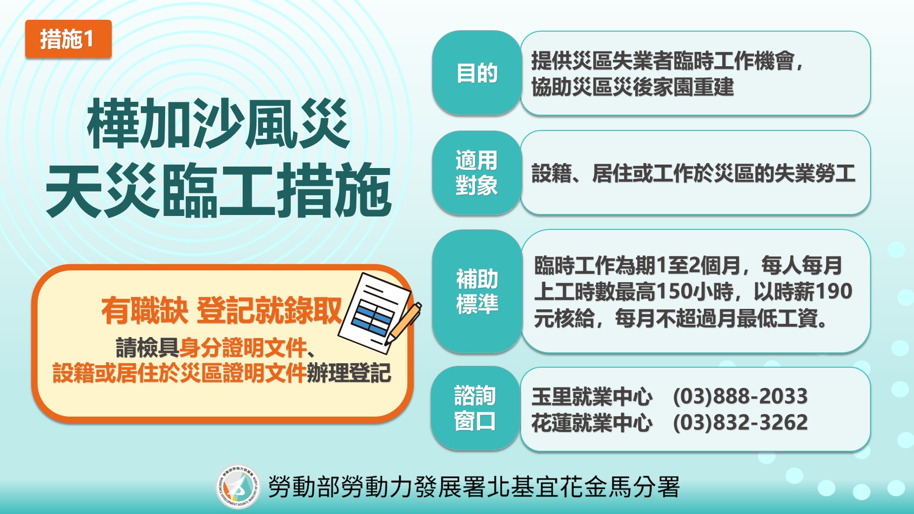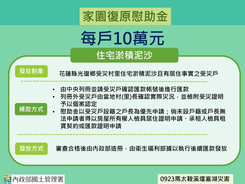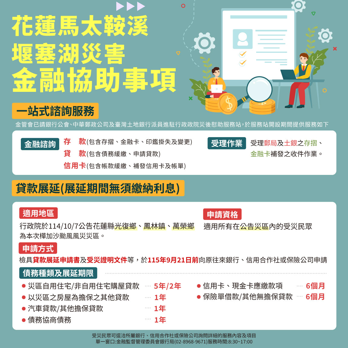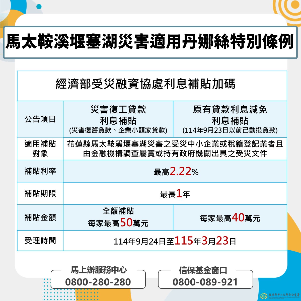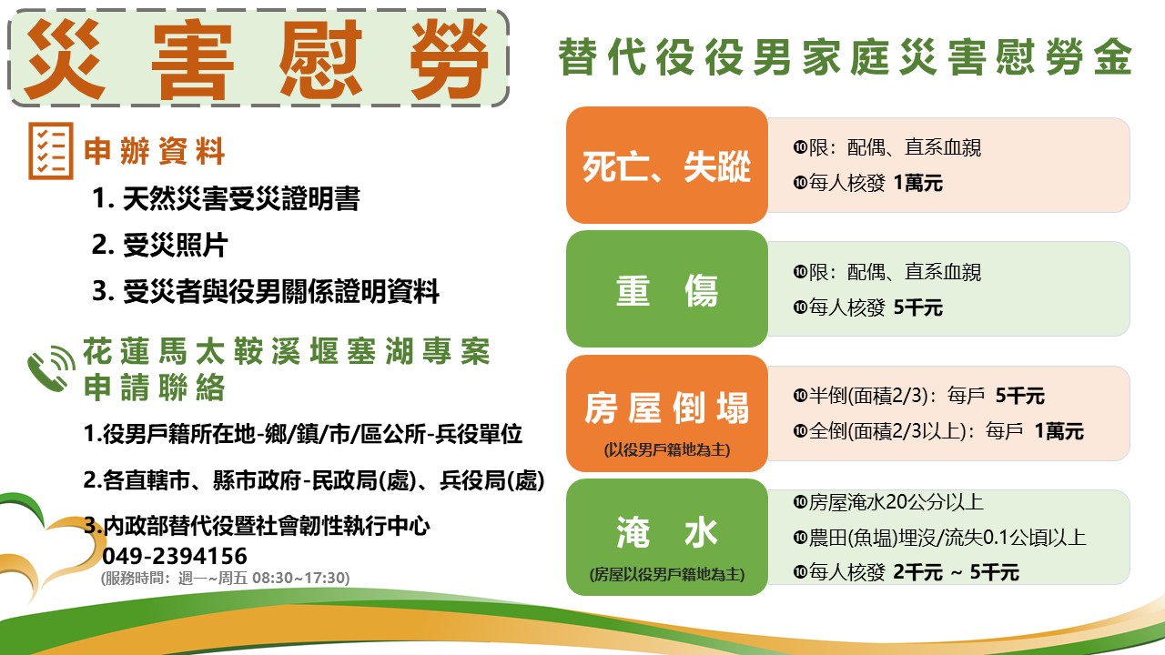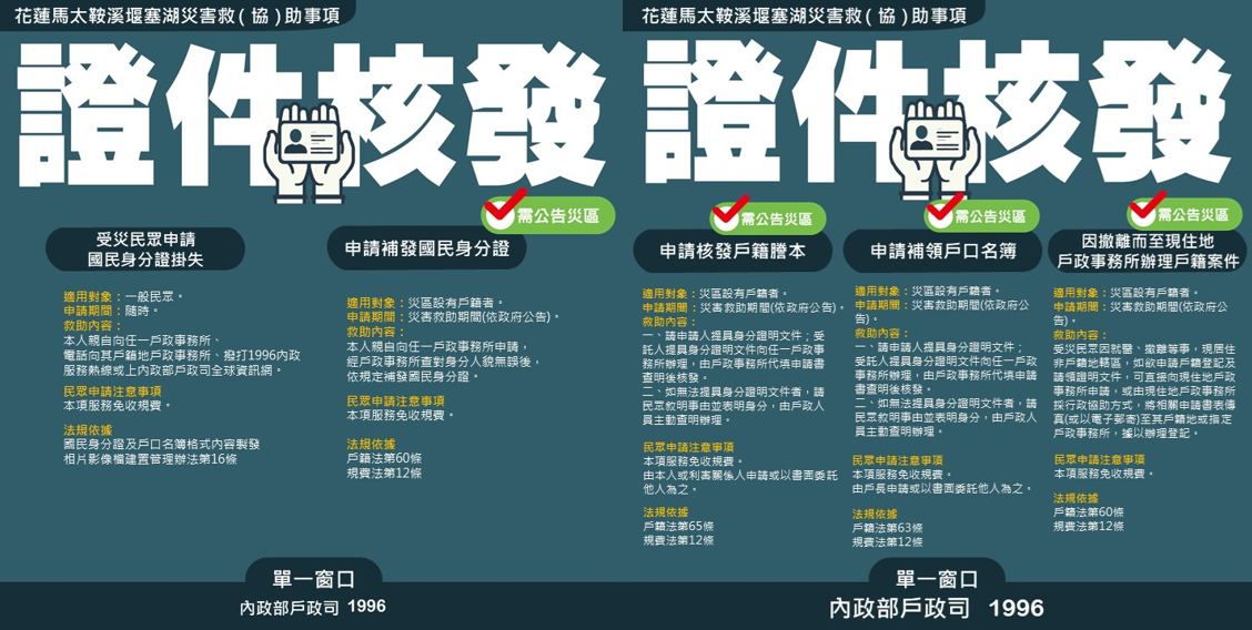 為利重大天然災害發生後即時揭露政府各項提供受災民眾之「災害救(協)助事項」,本會報已彙整相關機關(單位、機構)「花蓮馬太鞍溪堰塞湖專案災害救(協)助事項」公告連結「一站式網頁」,以強化災後復原資訊揭露並供民眾即時查閱。相關「災害救(協)助事項」如下所示,各部會措施請點以下相關連結。