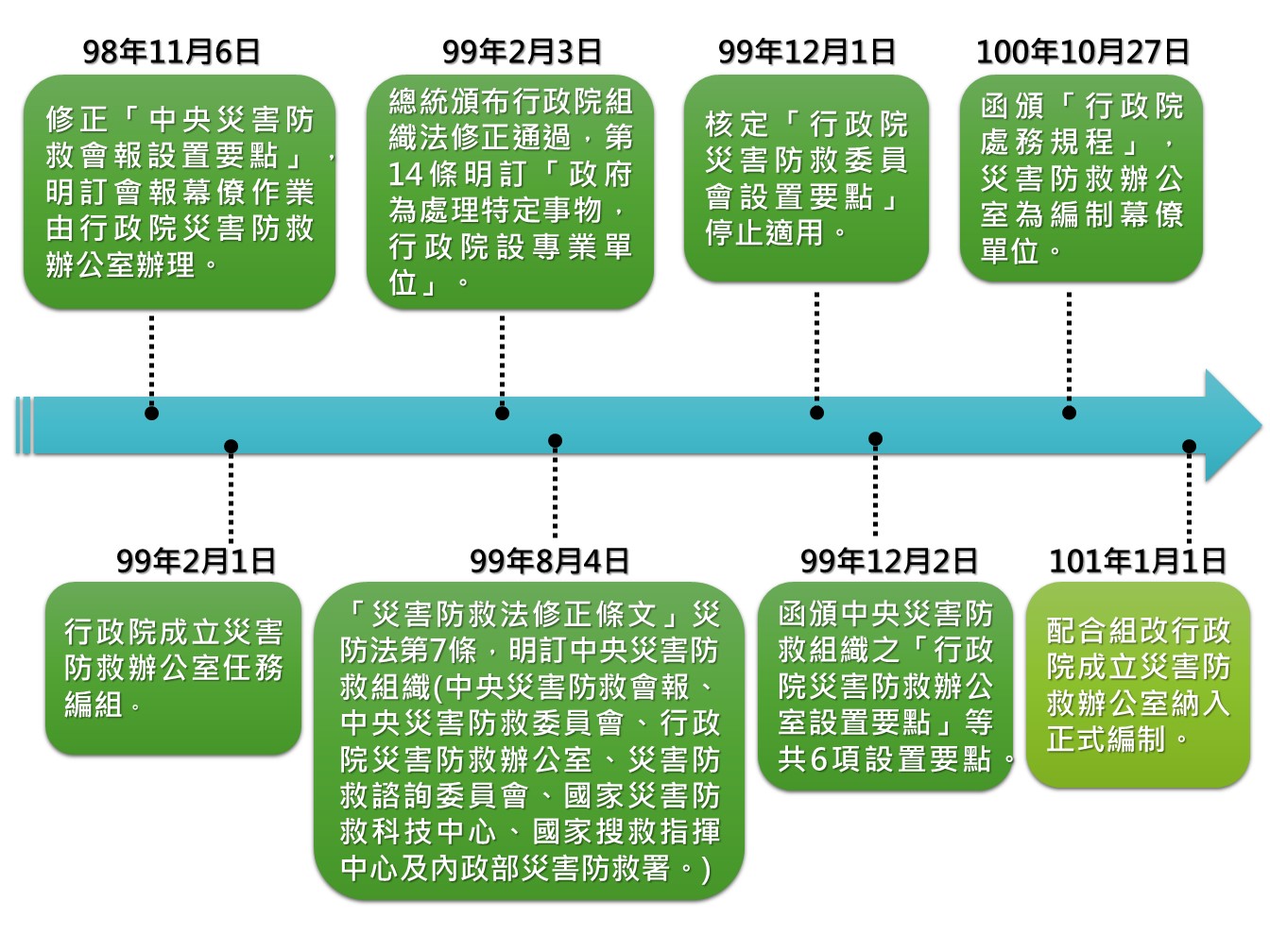 (三)組織沿革:災害防救辦公室成立之初,係屬行政院常設任務編組單位(99年2月1日至100年12月31日),而後因災害防救益形重要,並配合行政院院本部組織再造,於101年1月1日於行政院院本部納入正式編制單位,成立災害防救辦公室,置專責人力,其組織名稱納入行政院處務規程,如下圖。